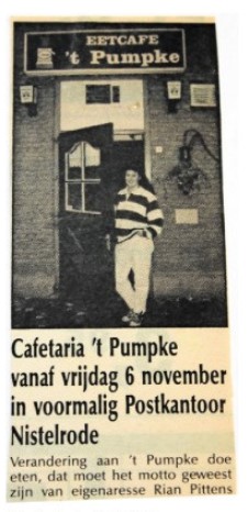 Het pand komt leeg te staan en menig Nistelrodenaar speculeert welke bestemming deze mooie locatie gaat krijgen. Rian van Schijndel-Pittens: “Voor mij, als uitbater van Eetcafé ’t Pumpke toendertijd, was het meteen duidelijk: daar kan de snackbar van ’t Pumpke vanaf het Raadhuisplein naartoe verhuizen. Eetcafé ’t Pumpke werd sinds de opening in juni 1990 steeds drukker bezocht en de keuken, die ook gebruikt werd voor de snackbar, was eigenlijk veel te klein, vooral in de zomer als het grote terras vol zit. Echter, het voormalig PTT-kantoorpand werd verkocht en was te duur om aangekocht te worden voor mij, als startende ondernemer.”